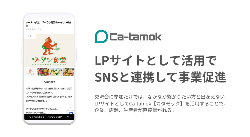 Ca-tamok[カタモック]では、会社・店舗・生産者などの魅力をよりユーザー様・事業者様同士に知っていただき事業促進を支援するサービスです。